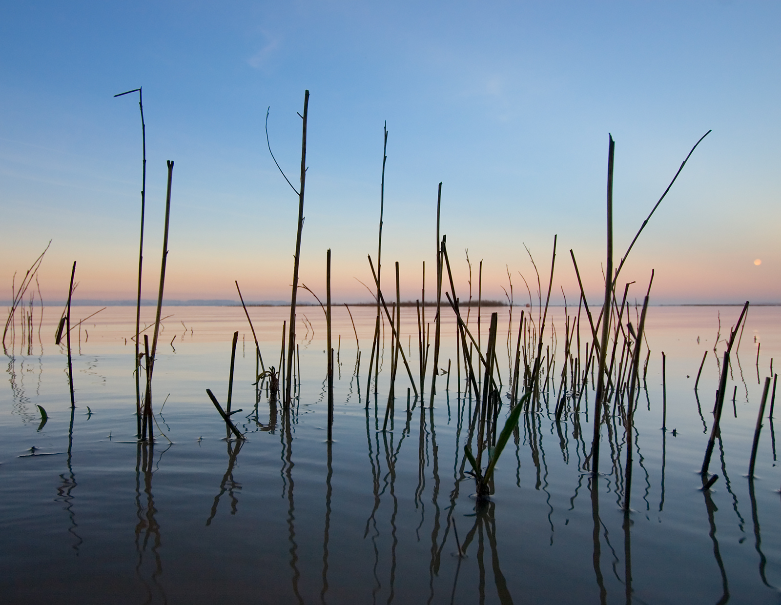 An early morning view of the River Humber from Brough Foreshore. The still air on this chilly February morning leaves the river undisturbed and the dawn pinks are reflected in its mirror-like surface. The low viewpoint puts the viewer in amongst the silhouetted reeds that break the horizon. The silver moon is just visible to the extreme right of the picture.