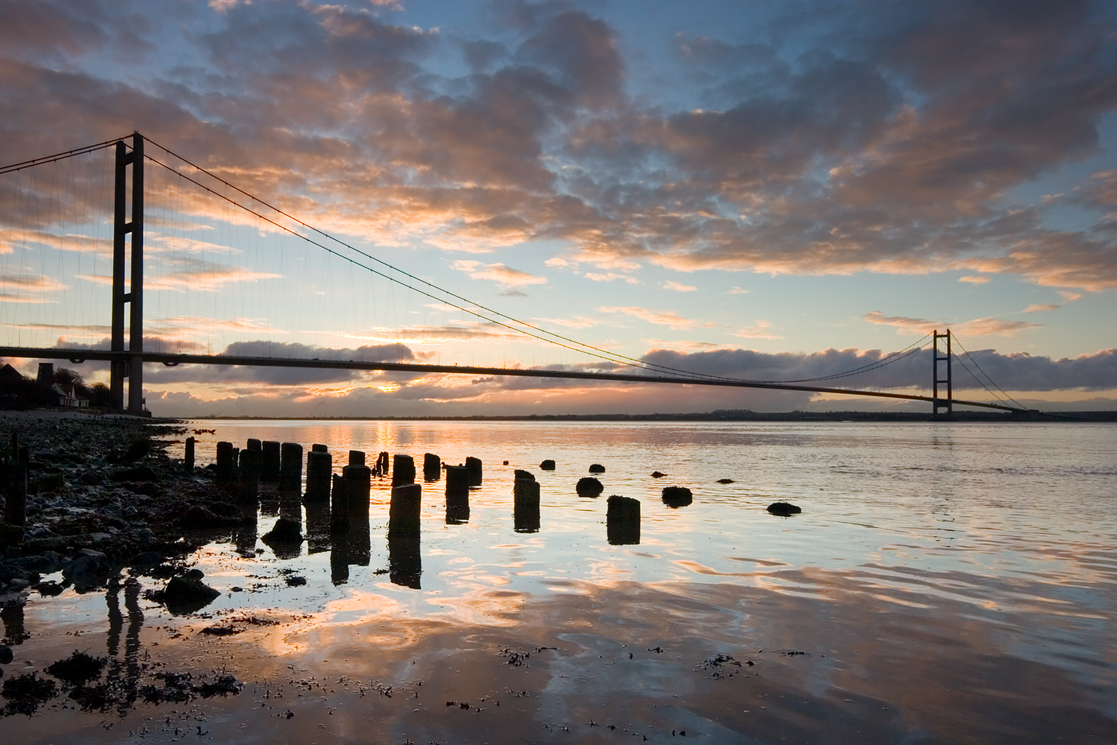 Another early morning on Hessle Foreshore. The sun is still below the eastern horizon but the rose-coloured light gives the clouds a fabulous salmon pink hue which contrasts nicely with the cold, clean blue of the January sky. The chill of the morning leaves the air still leaving the Humber’s surface almost undisturbed. Its mirror-like quality perfectly reflects the colours of the sky providing stark contrast for the silhouette of the Humber Bridge and the timbers jutting from the water in the foreground.