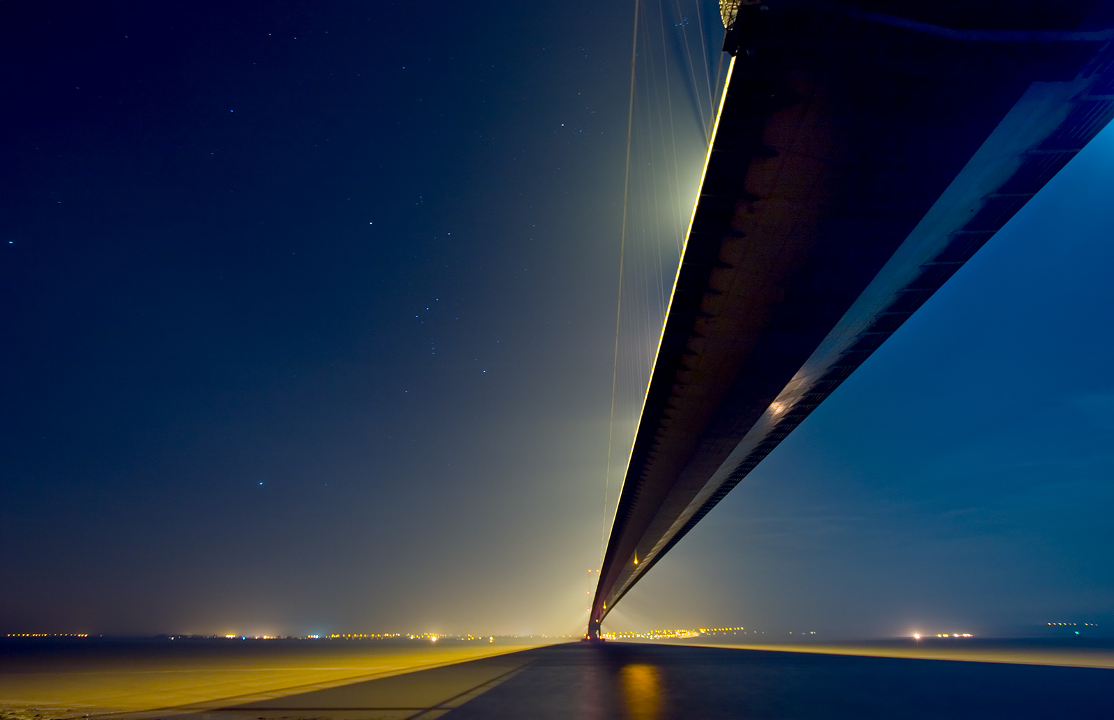 This long exposure photograph of Humber Bridge reveals the constellations in the southern sky with amazing clarity. Orion The Hunter is clearly visible in the centre of the image and in the original several others can be seen including Canis Major The Great Dog (the larger of Orion’s two hunting dogs), Lepus The Hare (Orion’s prey), Eridanus The River and Taurus The Bull. The stars were hidden from the naked eye at the time.